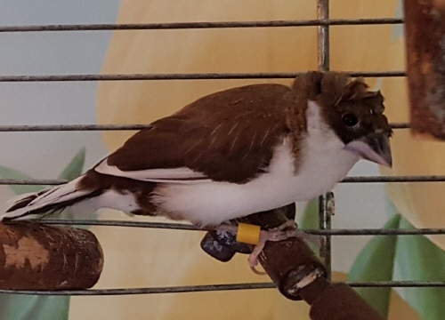 Ватсон Ватсон - хохлатый пестрый бело-шоколадный самец сэдлбэк панда с воротником |