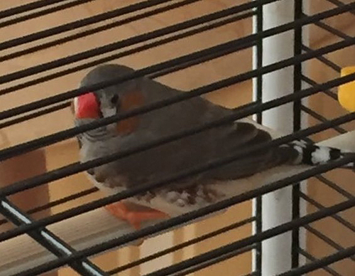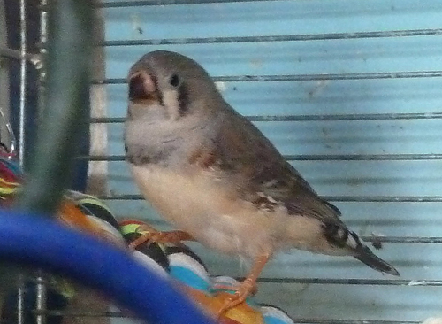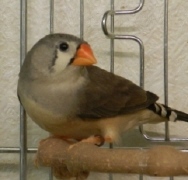 Кира - крупная чернолицая черногрудая серая самка щепная на чернощеких и оранжевогрудых (коричневое кольцо на левой лапке):