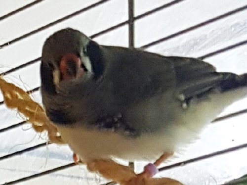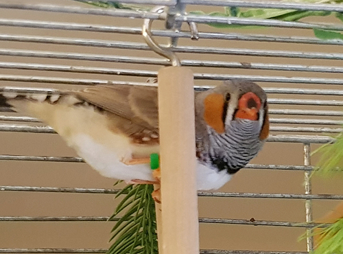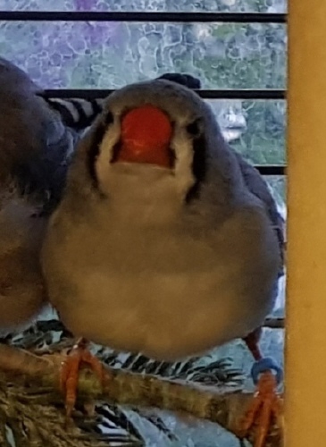 Ирида - чернощекая серая самка (коричневое кольцо на правой лапке):