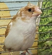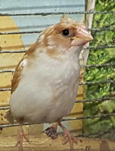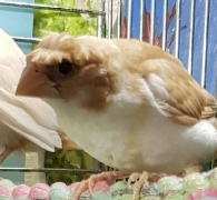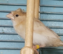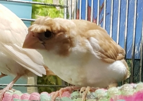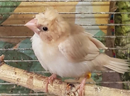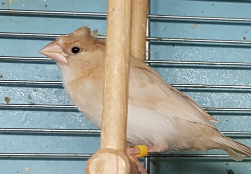 Эльф - хохлатый (2 хохла) светлокрылый палевый самец (желтое кольцо на левой лапке):