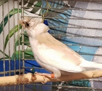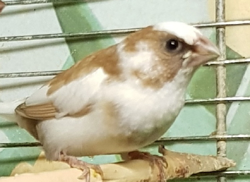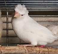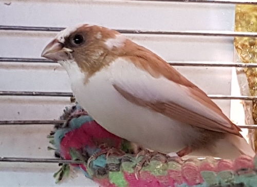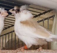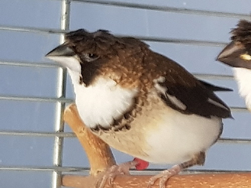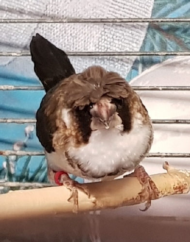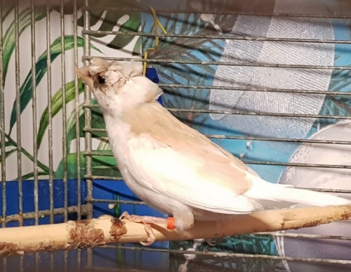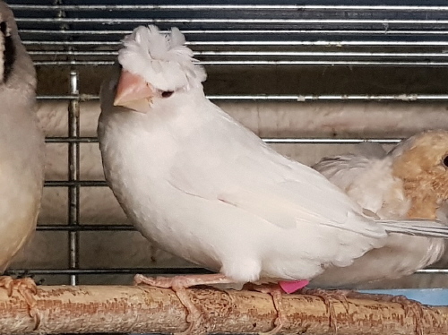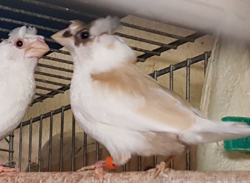 Лучик - хохлатый бело-каштановый осветленный самец сэдлбэк панда (оранжевое кольцо на левой лапке):