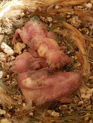 Гнездование №251: Птенцы от пары Шмелик и Клео, рождение 09.02.20 (3 птенца)