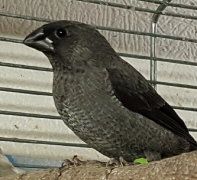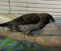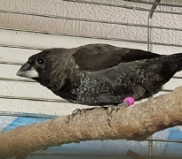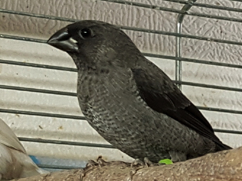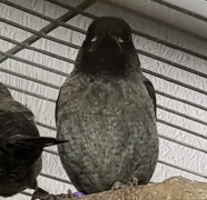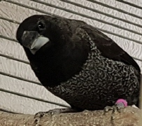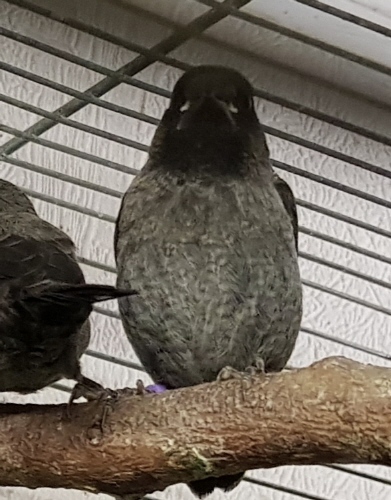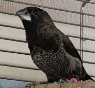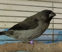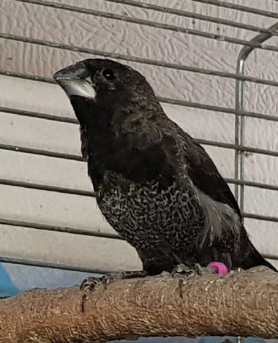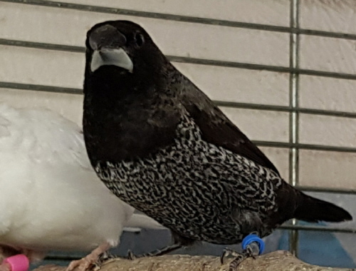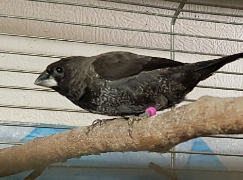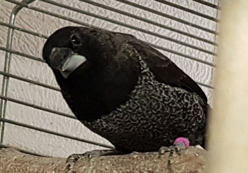 Бэй - крупный черно-серый самец щепный на черных (розовое кольцо на левой лапке):