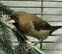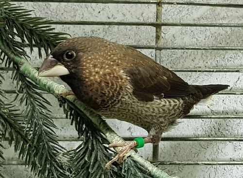 Крупный черно-коричневый самец щепный на жемчужных (зеленое кольцо на левой лапке):
