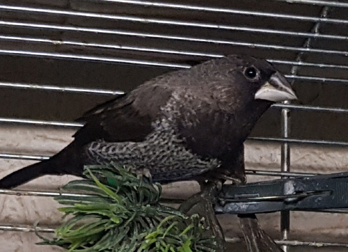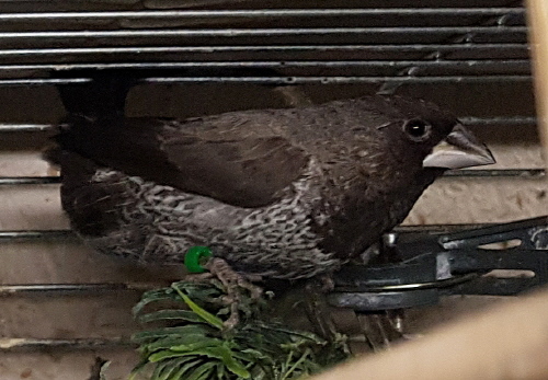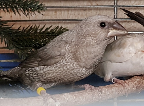 Шена - крупная жемчужная самка (желтое кольцо на правой лапке):