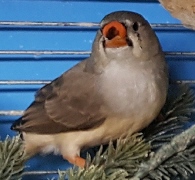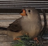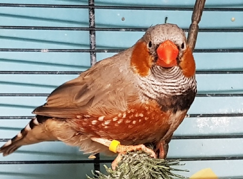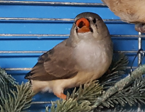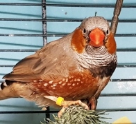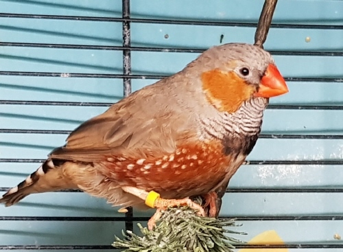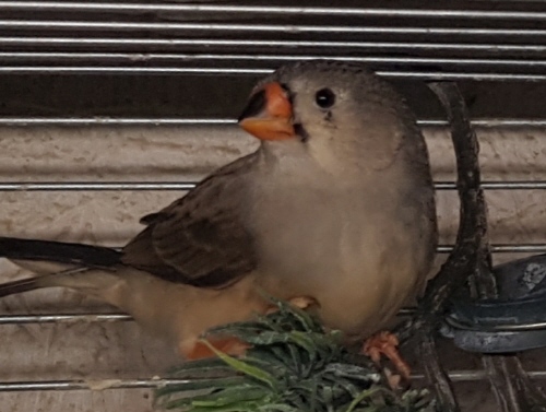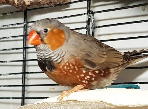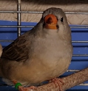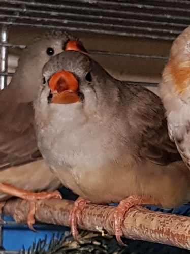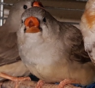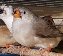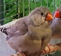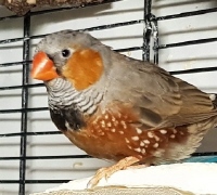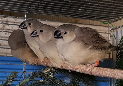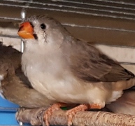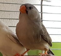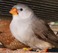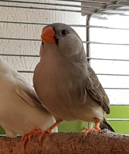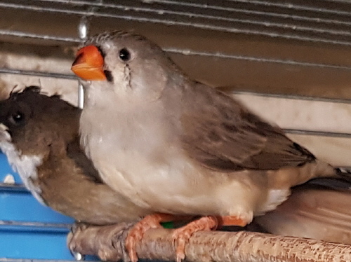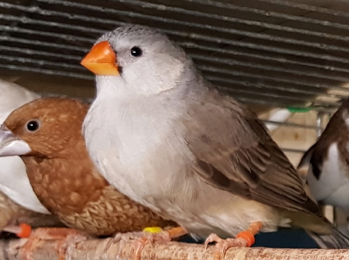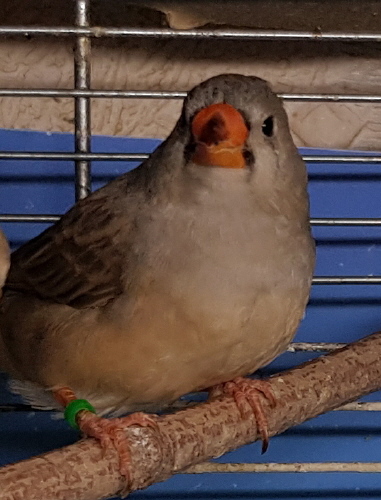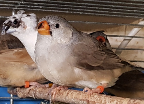 Фиби - очень крупная чернолицая черногрудая серая самка щепная на оранжевогрудых и изабель (оранжевое кольцо на левой лапке):