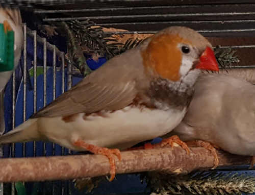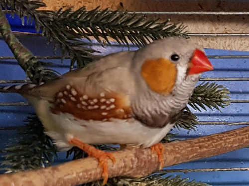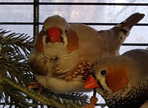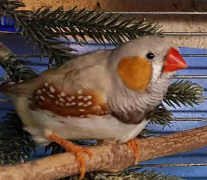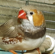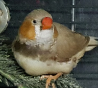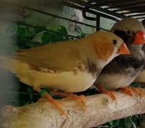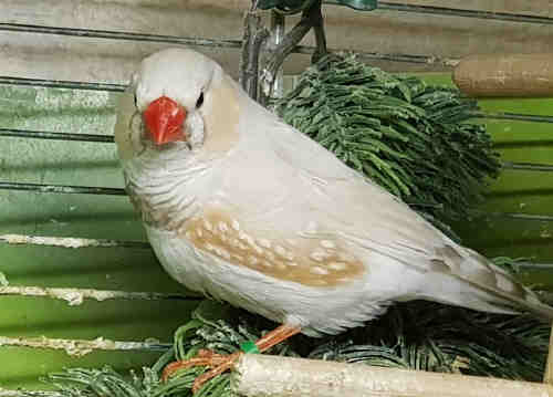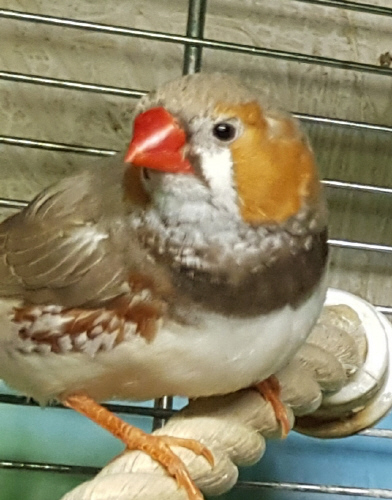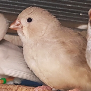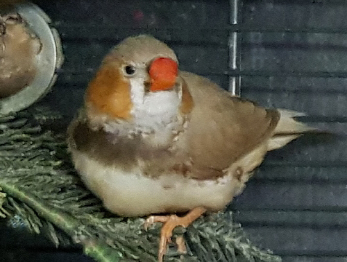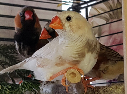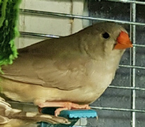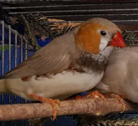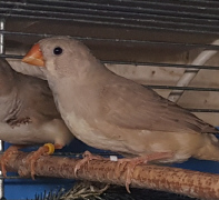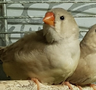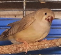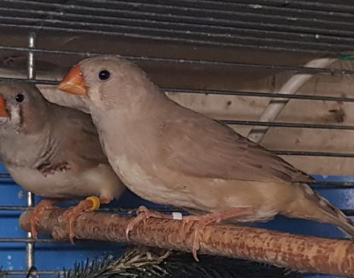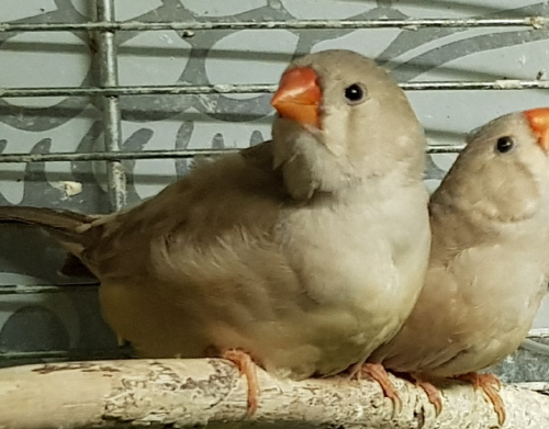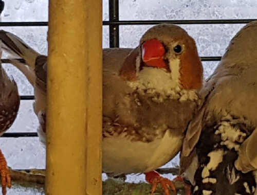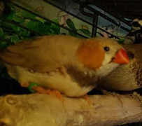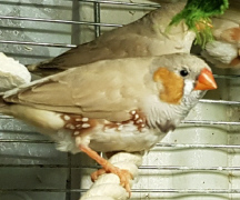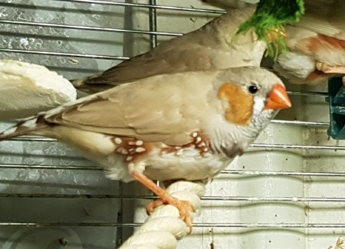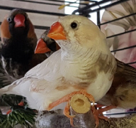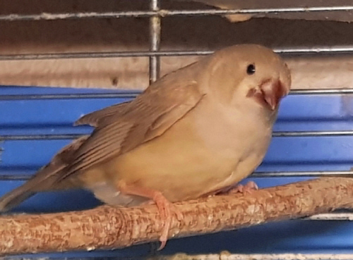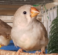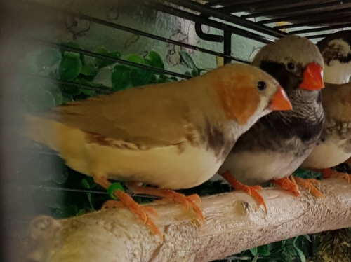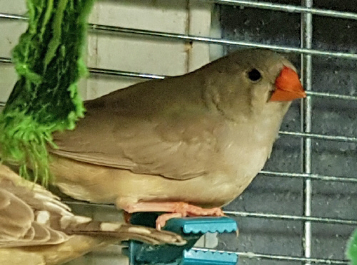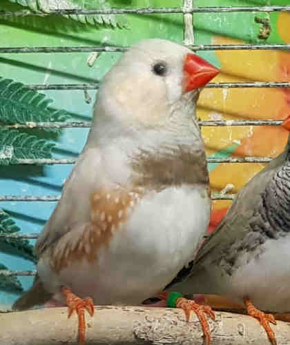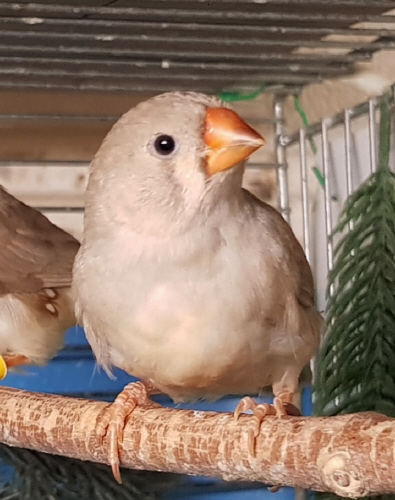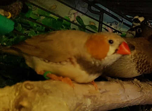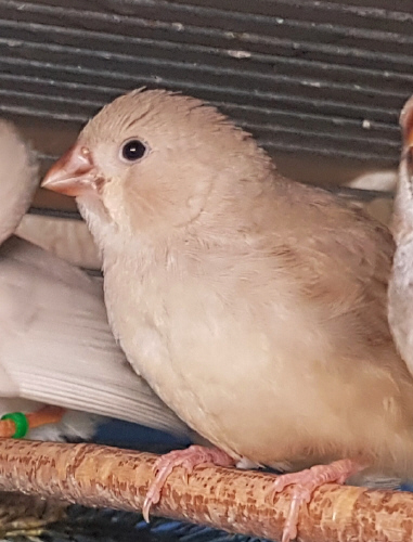 Плюшка - палевая самка щепная на черногрудых, чернощеких и оранжевогрудых (белое кольцо на правой лапке):
