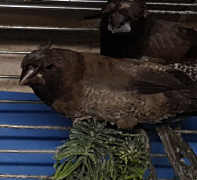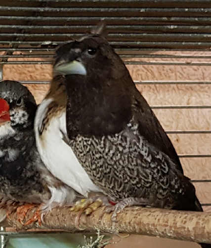 Эрнесто - крупный хохлатый черно-коричневый самец (зеленое кольцо на правой лапке):