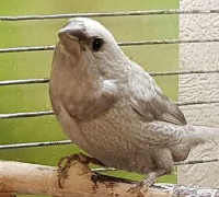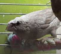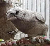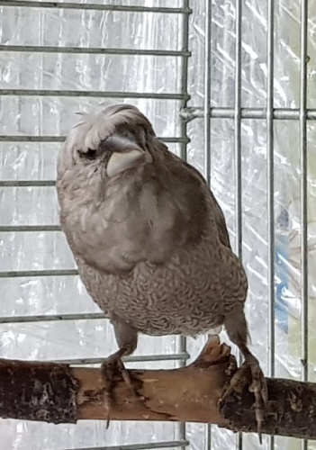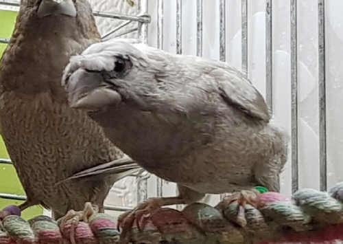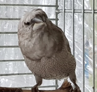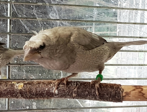 Крупная хохлатая жемчужно-серая самка (зеленое кольцо на левой лапке):