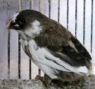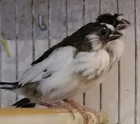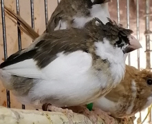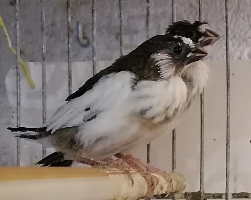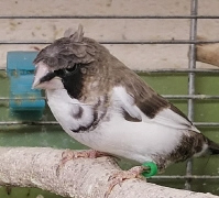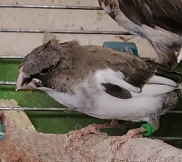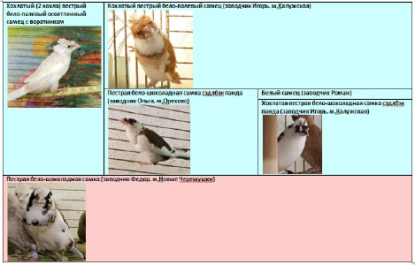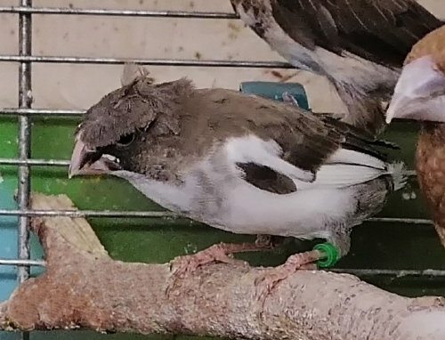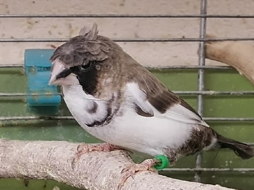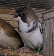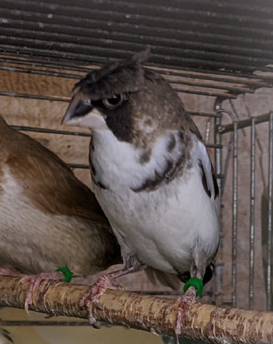 Чезар - хохлатый (2 хохла) пестрый бело-шоколадный самец с воротником (зеленое кольцо на левой лапке):