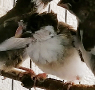 Хадсон - хохлатый (2 хохла) пестрый бело-шоколадный самец с воротником (коричневое кольцо на правой лапке):