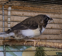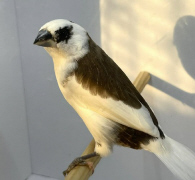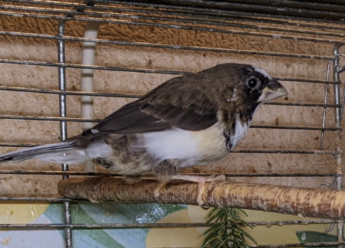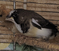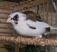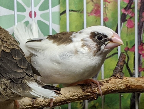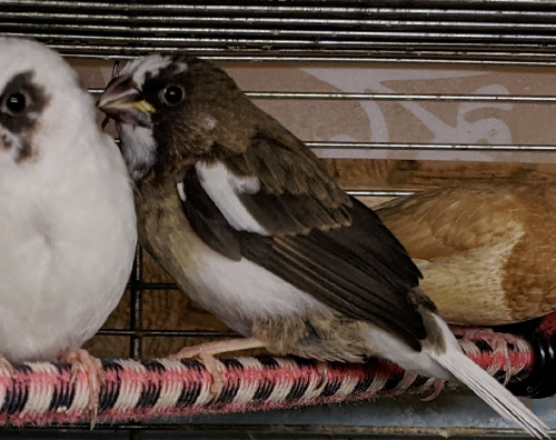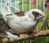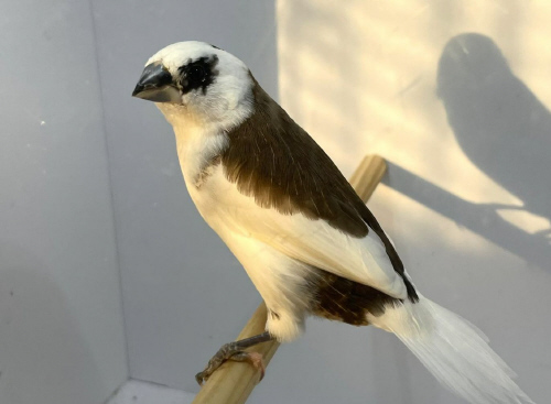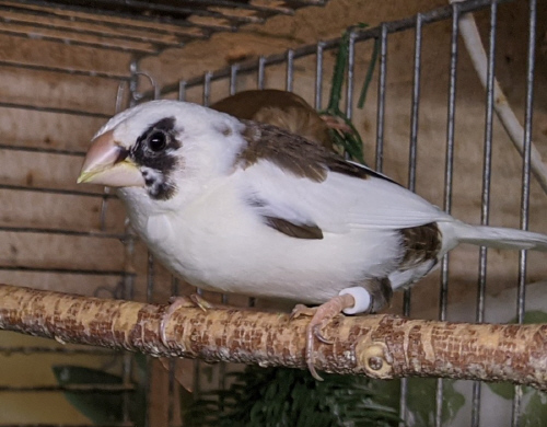Франт - пестрый бело-шоколадный самец сэдлбэк панда (белое кольцо на левой лапке):