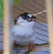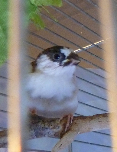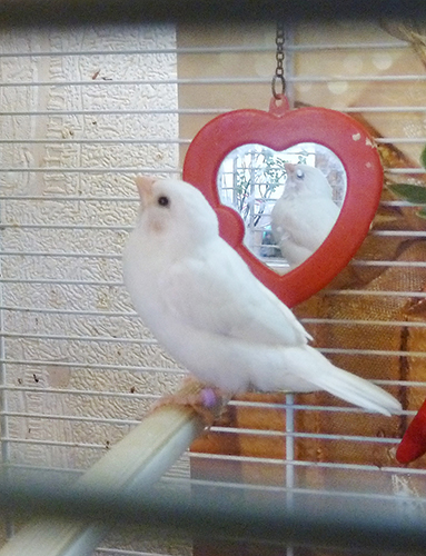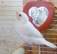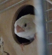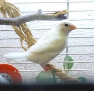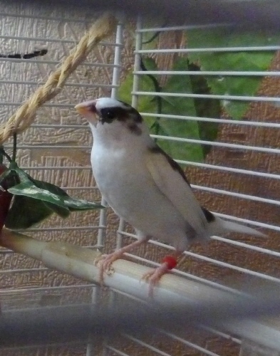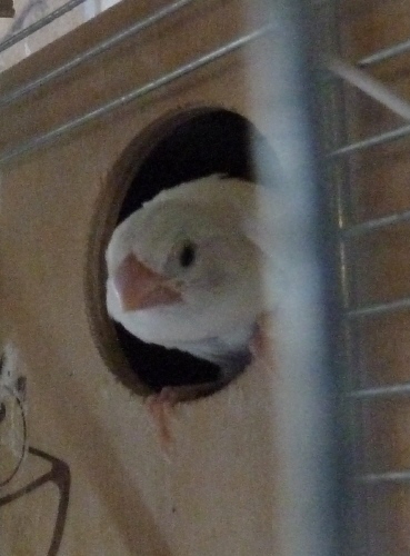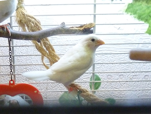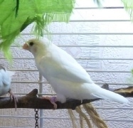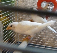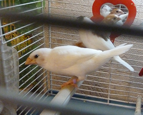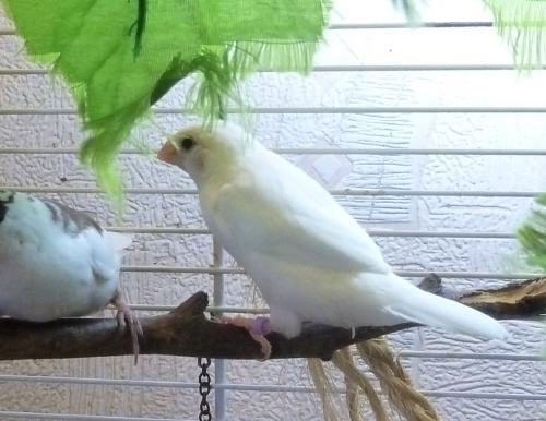 Кузя - белый самец (оранжевое кольцо на правой лапке):