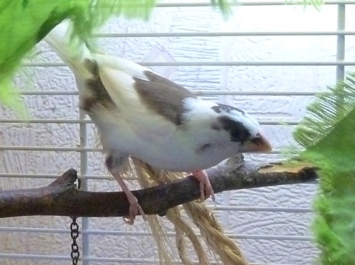 Киря - пестрый бело-шоколадный самец сэдлбэк масковый (желтое кольцо на правой лапке):