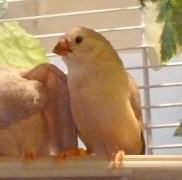 Нюша - чернолицая черногрудая палевая самка щепная на оранжевогрудых и чернощеких (желтое кольцо на правой лапке):