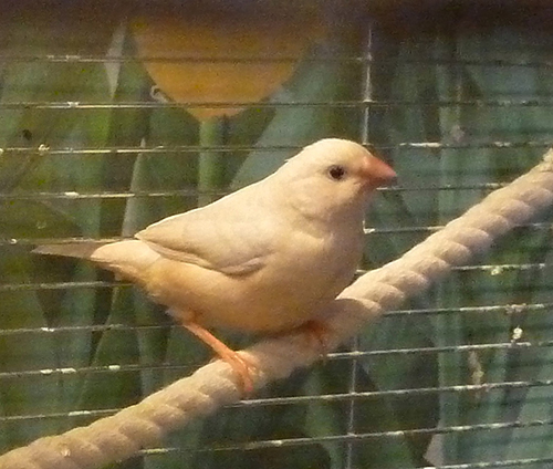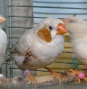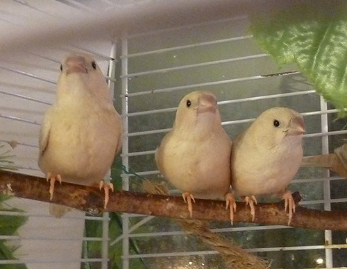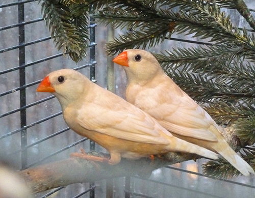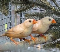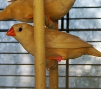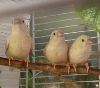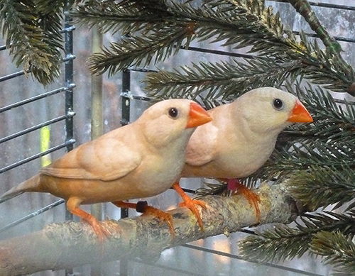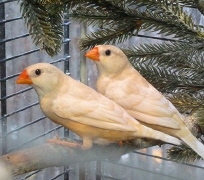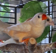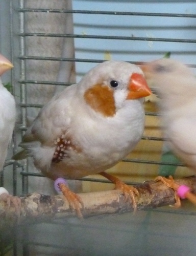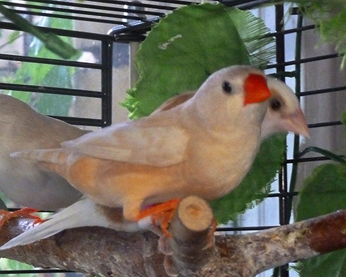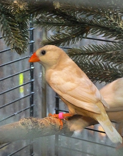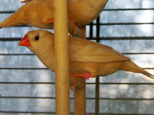Виола - черногрудая самка палевый изабель щепная на оранжевогрудых (розовое кольцо на левой лапке):
