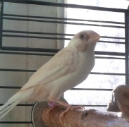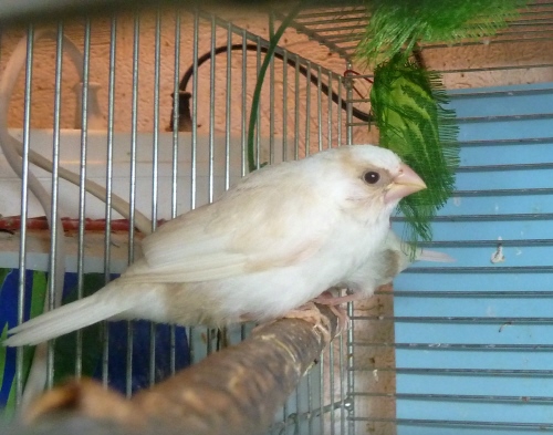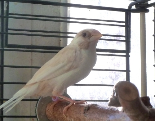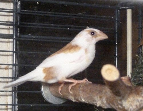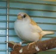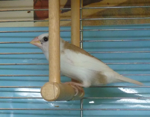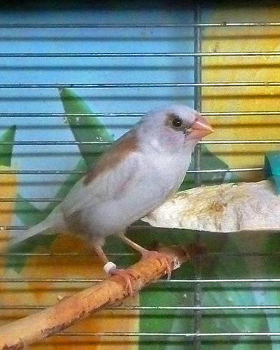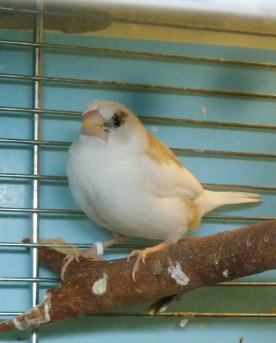 Энди - пестрый бело-палевый осветленный самец сэдлбэк масковый (сиреневое кольцо на левой лапке):