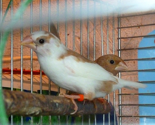 Лайза - пестрая бело-палевая самка сэдлбэк панда (оранжевое кольцо на левой лапке):