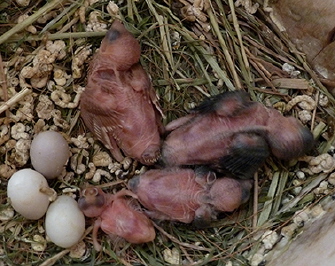 - птицы думают, что им не хватит корма, чтобы прокормить птенцов. В клетке всегда должна быть минеральная подкормка, измельченная яичная скорлупа, сепия. За день до предполагаемого вылупления птенцов начинайте давать птицам измельченное вареное яйцо и вареную без молока пшенную кашу, чтобы птицы видели, что им есть, чем кормить птенцов.